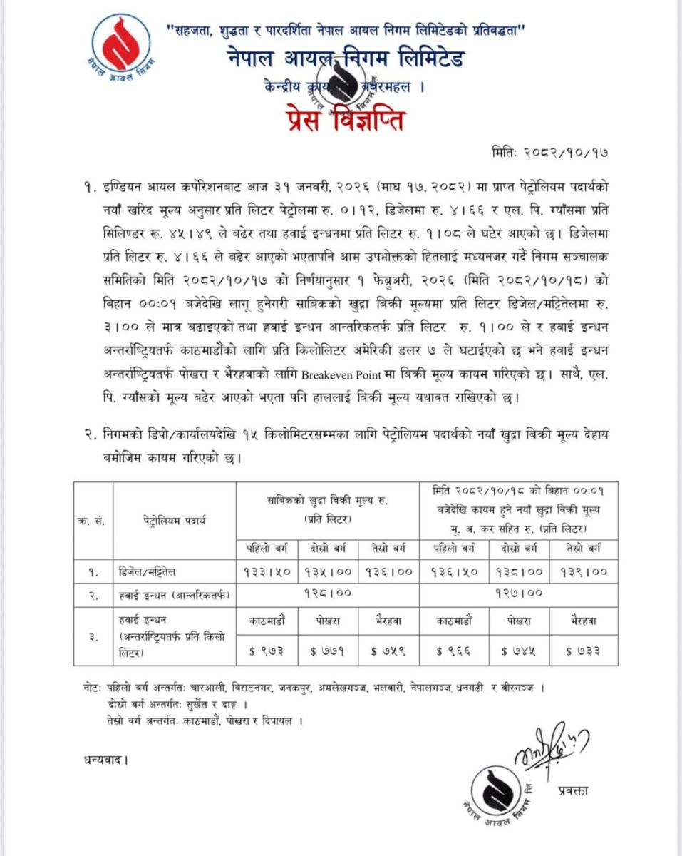निगमले भारतबाट पेट्रोलमा प्रतिलिटर ०.१२ रुपैयाँ र डिजल तथा मट्टितेलमा ४.६६ रुपैयाँले बढेर आएको जानकारी दिएको छ । पेट्रोलको मूल्य भने यथावत रहेकाे छ । त्यस्तै, निगमले हवाई इन्धनको आन्तरिकतर्फ प्रति लिटर १ रुपैयाँ घटाएको छ भने अन्तर्राष्ट्रियतर्फ काठमाडौंका लागि प्रतिकिलो लिटरमा ७ अमेरिकी डलर घटाएको छ ।