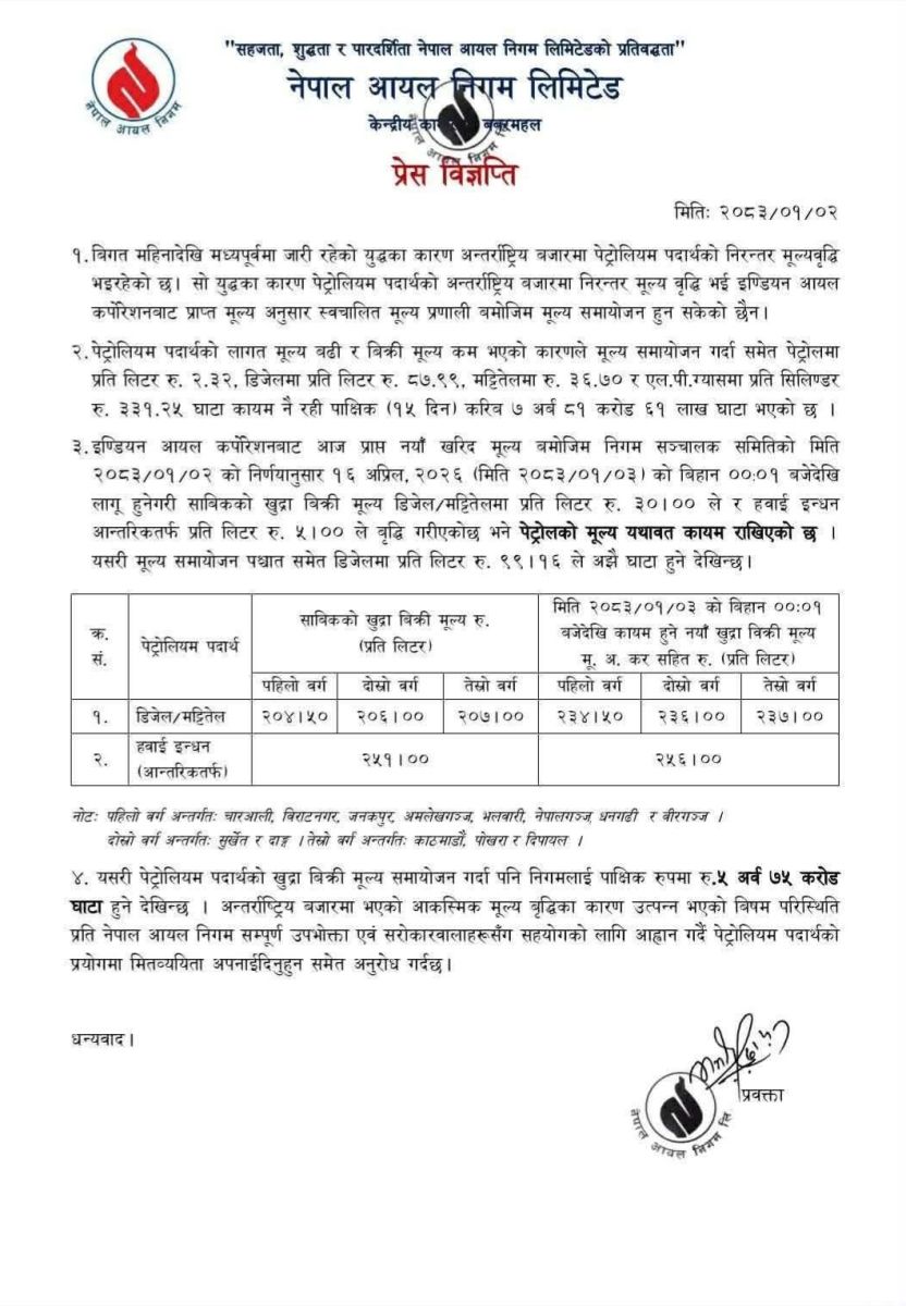 निगम सञ्चालक समितिको बैठकले आजदेखि लागू हुनेगरी नयाँ मूल्य निर्धारण गरेको हो । निगमका अनुसार डिजेल र मट्टितेलमा प्रतिलिटर ३० रुपैयाँ र हवाई इन्धन (आन्तरिकतर्फ)मा प्रतिलिटर ५ रुपैयाँ वृद्धि गरिएको छ । यद्यपि, पेट्रोलको मूल्य भने हाललाई यथावत् राखिएको निगमले बताएको छ ।