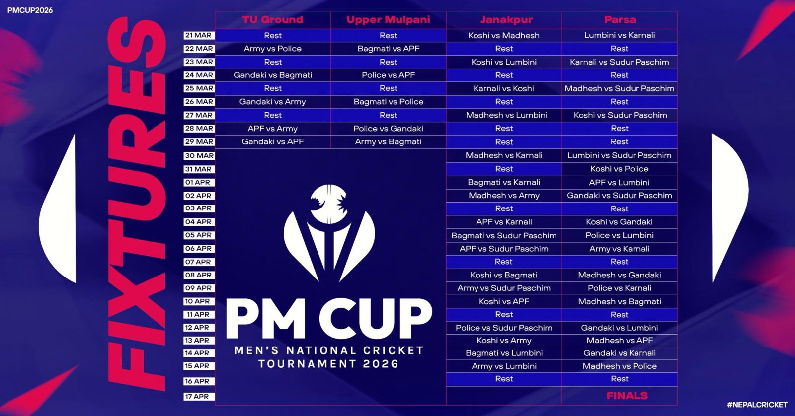 काठमाडौं । यसवर्षको प्रधानमन्त्री कप (पीएम कप) पुरुष एकदिवसीय राष्ट्रिय क्रिकेट प्रतियोगिता चैत ७ गतेदेखि सुरु हुने भएको छ ।