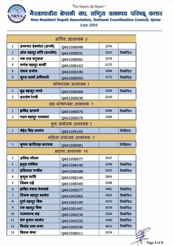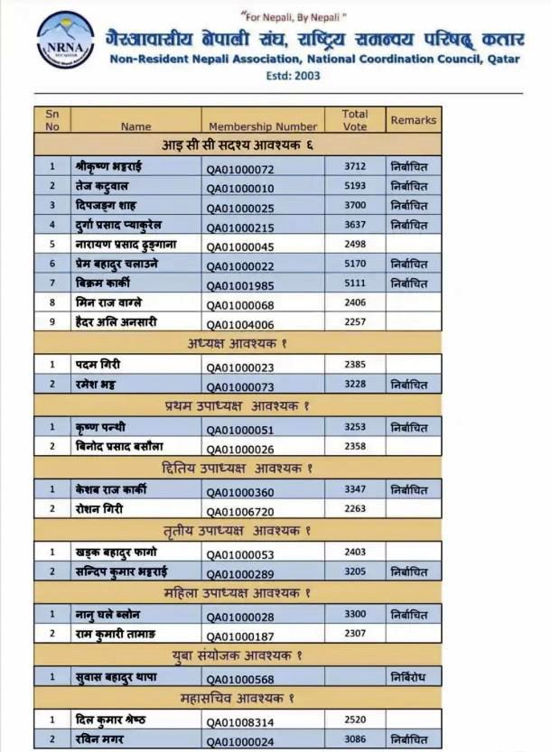 कतार। गैर आवासीय नेपाली संघ (एनआरएनए) कतारको अध्यक्षमा रमेश भट्ट निर्वाचित भएका छन्। आज सम्पन्न निर्वाचनमा प्रतिस्पर्धी पदम गिरीलाई झण्डै एक हजार मतले पछि पार्दै भट्ट अध्यक्षमा निर्वाचित भएका हुन् ।