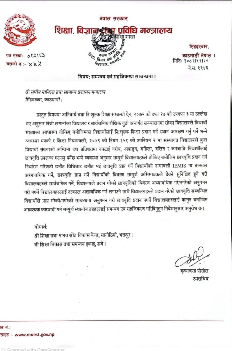 साथै छात्रवृत्ति प्राप्त गर्ने विद्यार्थीको विवरण सम्पूर्ण अभिभावकले देख्ने सुनिश्चित हुने गरी विद्यालयहरुले सार्वजनिक गर्ने तथा विद्यालयले प्रदान गरेको छात्रवृत्तिको विवरण अध्यावधिक गरे र नगरेको अनुगमन गरी नगर्ने विद्यालयलाई तत्काल अद्यावधिक गर्न लगाउने पत्रमा भनिएको छ ।