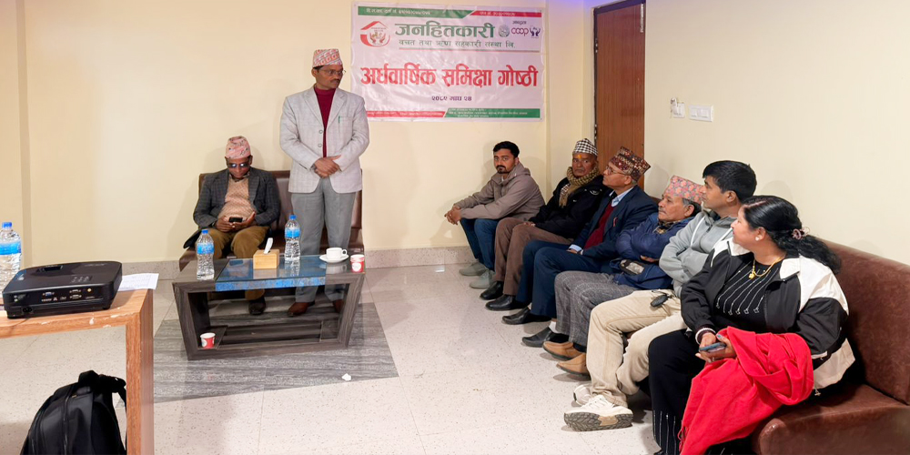सुर्खेत । जनहितकारी बचत तथा ऋण सहकारी संस्थाको अर्धवार्षिक समीक्षा गोष्ठी वीरेन्द्रनगर–११ पिपिरा स्थित डि.एफ.सी. होटलमा भव्य रूपमा सम्पन्न भएको छ। संस्थाका अध्यक्ष नवराज कंडेलको अध्यक्षतामा सम्पन्न उक्त गोष्ठीमा प्रमुख अतिथि राष्ट्रिय सहकारी महासंघका केन्द्रीय सदस्य हरिहरनाथ योगीको विशेष उपस्थिति रहेको थियो ।