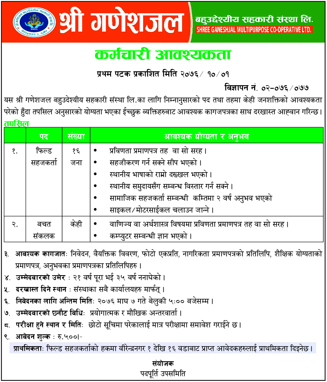 गणेशजल सहकारीमा रोजगारीको अवसर