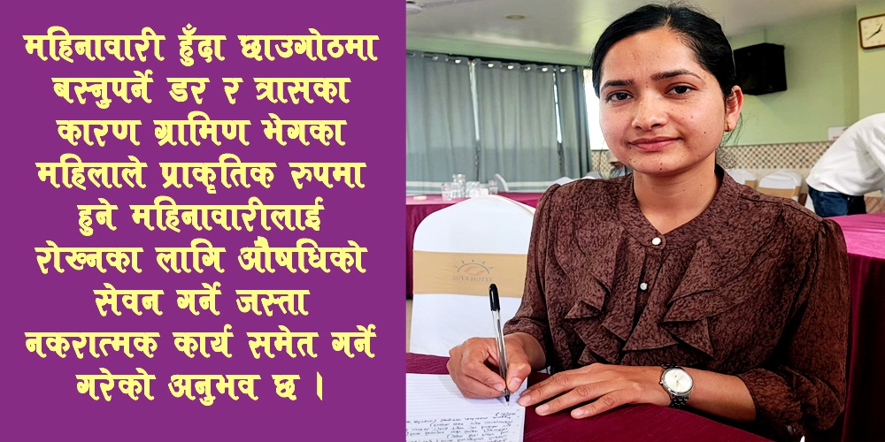 महिनावारी हुँदा छाउगोठमा बस्नुपर्ने डर र त्रासका कारण ग्रामिण भेगका महिलाले प्राकृतिक हुने महिनावारीलाई रोख्नका लागि औषधिको सेवन गर्ने जस्ता नकरात्मक कार्य समेत गर्ने गरेको अनुभव खड्काले जानकारी दिइन् ।