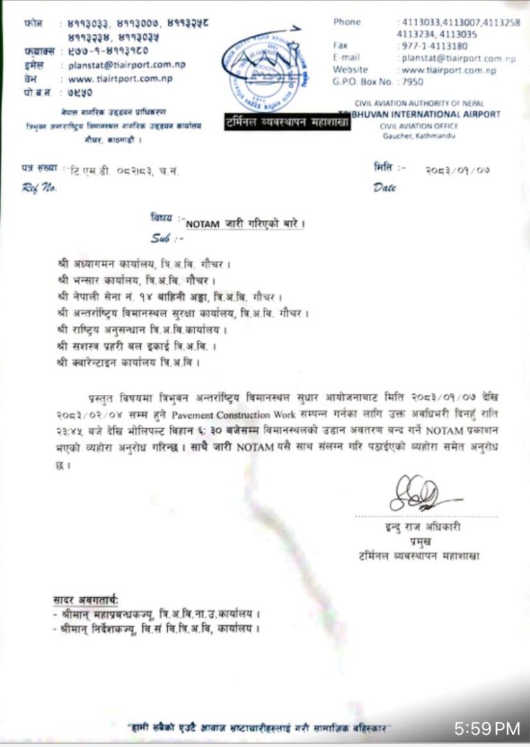विमानस्थल कार्यालयले नोटाम जारी गर्दै सोमबार रातिदेखि जेठ ४ गतेसम्म दैनिक बन्द हुने भएपछि उडान अवधि कटौती गरेको बताएको छ ।